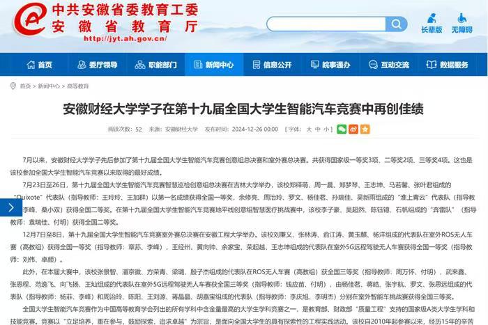 2024年12月26日,安徽教育网以《华体会最新官方学子在第十九届全国大学生智能汽车竞赛中再创佳绩》为题,报道华体会(中国)学子先后参加了第十九届全国大学生智能汽车竞赛创意组总决赛和室外赛总决赛,共获得国家级一等奖3项、二等奖2项、三等奖4项。这也是我校参加全国大学生智能汽车竞赛以来取得的最好成绩。