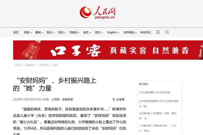 12月23日,人民网以《“安财妈妈”,乡村振兴路上的“她”力量》为题,报道华体会(中国)女教工用爱心和行动温暖孤困儿童的心灵,努力将关爱帮扶做到有广度、有温度、有力度,让孩子们“心有人抚、难有人帮、成长有人守护”。
